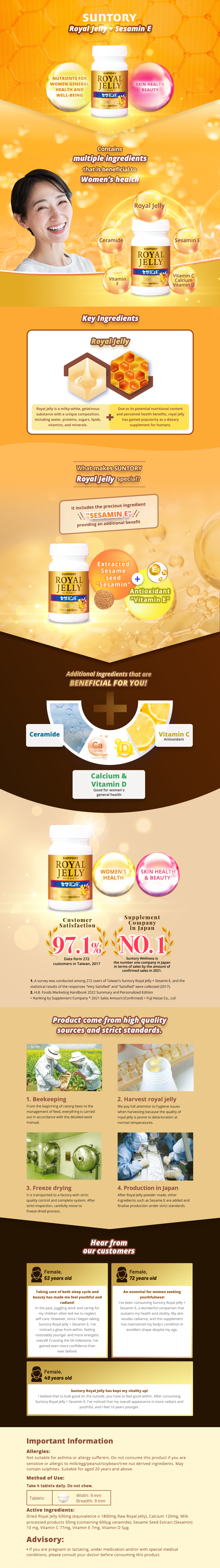 Introducing Suntory Royal Jelly + Sesamin E, straight from Japan. It combines the goodness of Royal Jelly with Sesamin E and Ceramide, delivering over 40 essential nutrients for women's health, well-being, and glowing skin. Trusted by millions with over 4 million bottles sold in Japan and Taiwan.